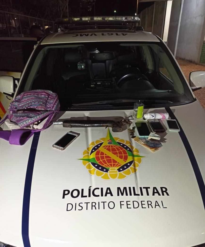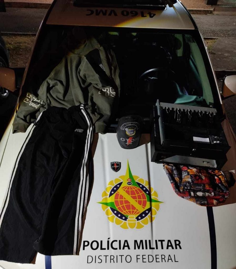 O indivíduo foi encontrado na quadra 3 do próprio Varjão. Após ser detido, revelou a localização dos itens roubados. Entre os objetos, estava a caixa registradora de uma farmácia, levada na mesma noite de sua prisão, além de pé-de-cabra e marreta, utilizadas para arrombar o estabelecimento.